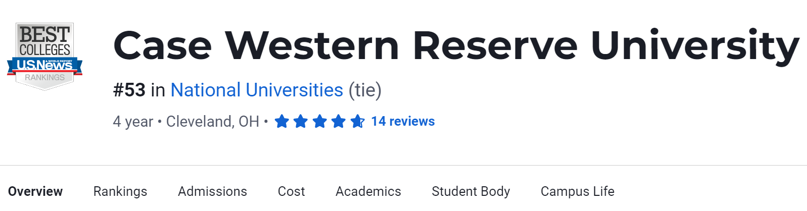 在2024年USNews美国大学排名中, 凯斯西储大学排名第53。