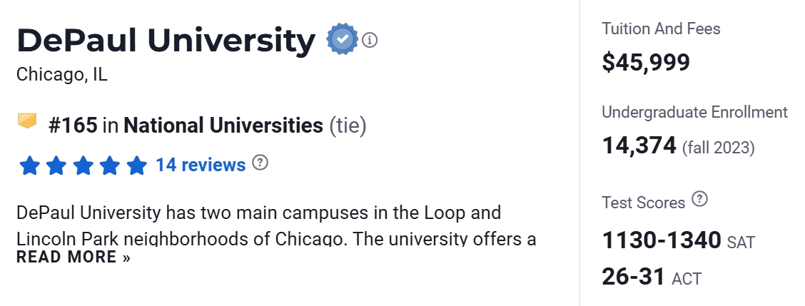 德保罗大学是全美规模最大的天主教大学和私立大学,也是伊利诺伊州最好的私立大学,以及美国东北部Big East体育联盟的成员之一。DPU办校的重点在于教学而非科研,学校致力于将理论教育与实践经验相结合,既教授学生们获得成功所需的知识,又为他们提供毕业之后找到理想工作所需的经验。