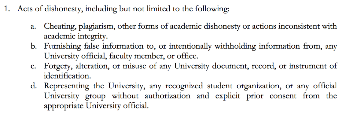 所有 西东大学 的学生都有责任遵守荣誉守则,保持学术诚信。除了学校的规定以外,每个学院也有学术诚信相关的标准和政策。通常情况下,学术不诚信的行为包括但不限于: