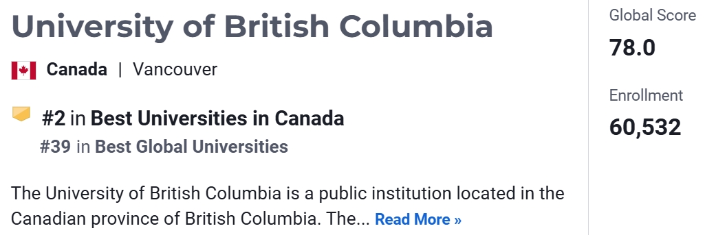 2025年USNEWS 加拿大学校综合排名中,UBC位于第2名;世界大学排名中位于第39名。