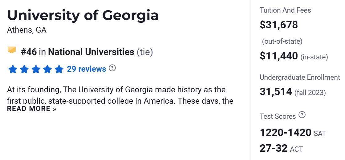 在2025年USNews美国大学排名中, 佐治亚大学排名第46。