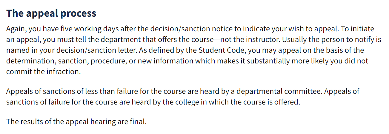 当导师认为有可疑的学术不诚信行为时,教师会通过电子邮件通知学生有理由相信学生违反了学术诚信。举报通知将说明讲师指控的内容,并提供足够的信息,以便学生可以对指控作出实质性回应。学生最多有 10 个工作日来回应指控。