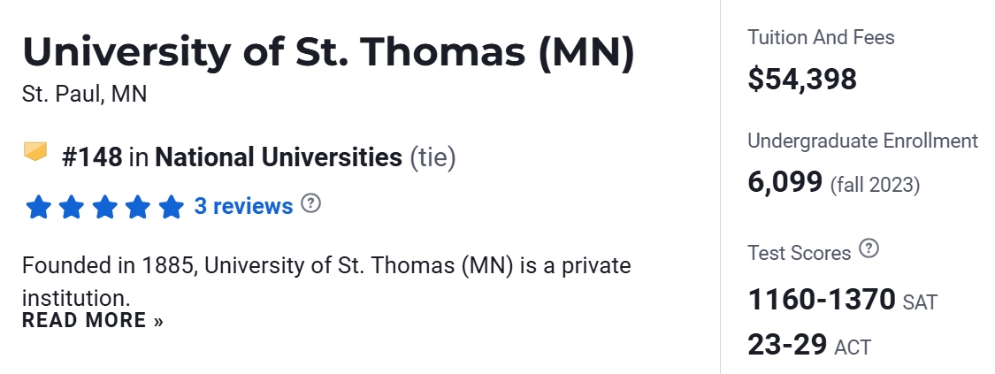 在2025 US News美国大学排名中,圣托马斯大学位于第148名。