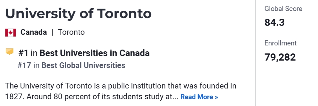 在2025USNews世界大学排名中,多大位于第17名,加拿大学校排名第一。