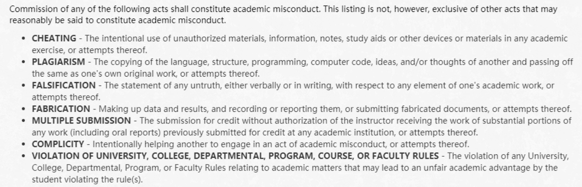 - 除非经课程导师特别授权,与其他学生合作完成指定的作业。学生应该假设所有作业均应单独完成,除非讲师明确表示。