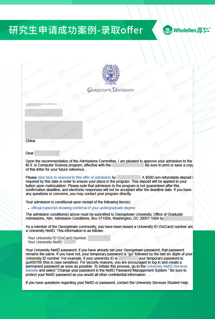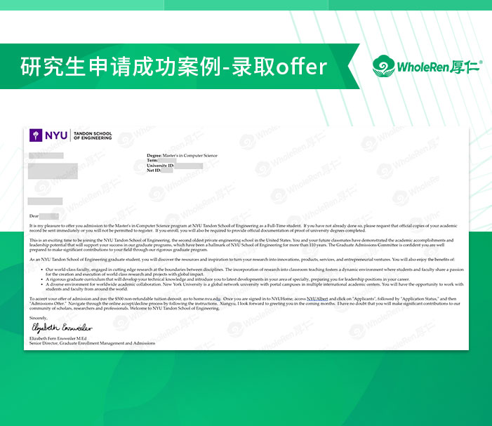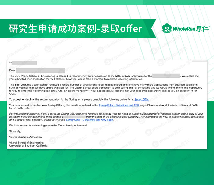 厚仁团队老师全面评估S同学的学术背景和择校意向,精心定制选校单。确定选校后,倾力指导S同学在文书中的合适地方解释自己的学术状况,扬长避短突显申请优势,最终用精彩的文书打动了招生官,规避了低GPA造成的影响。