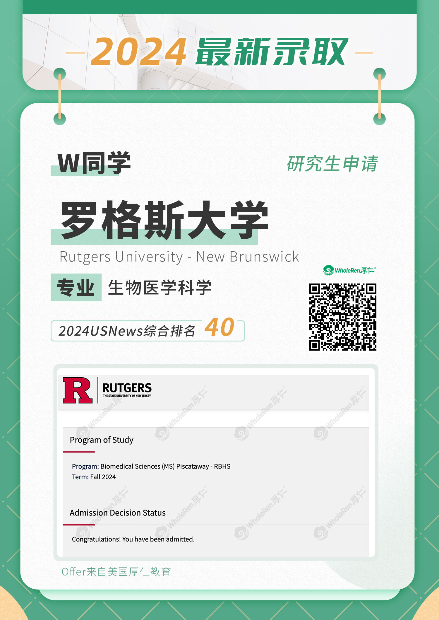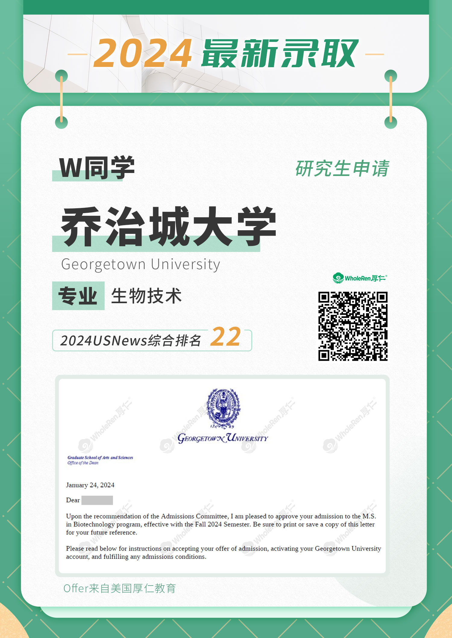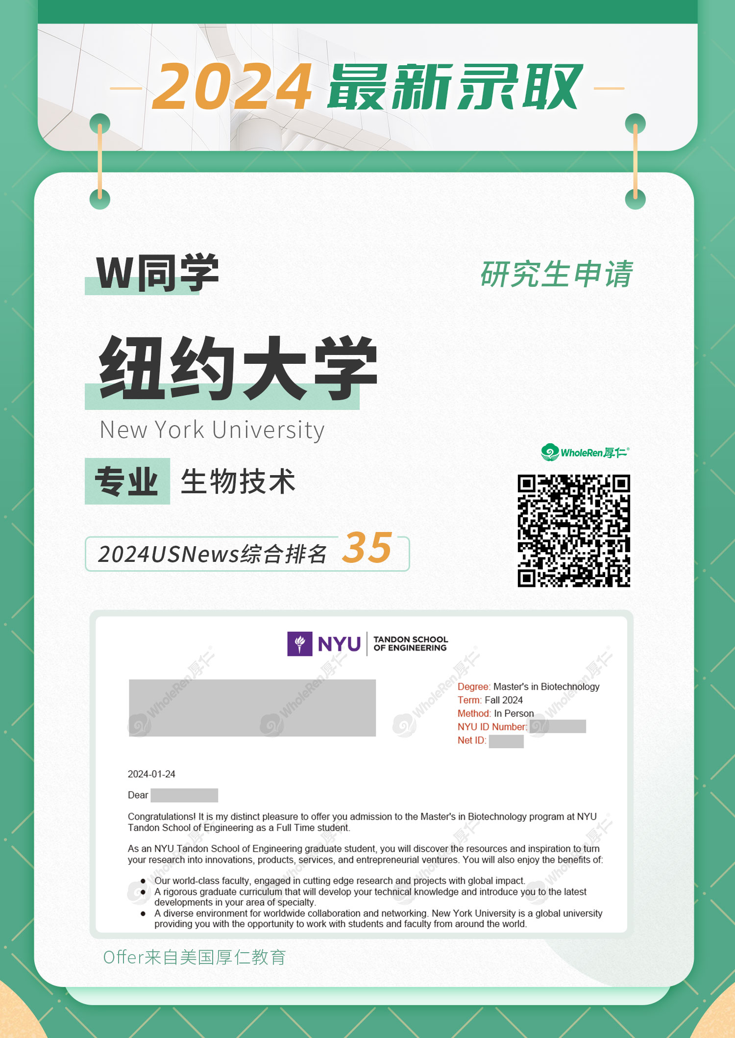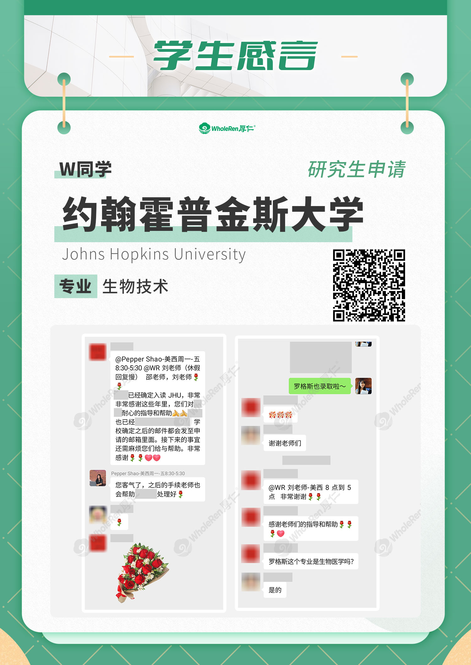 由于疫情的影响,学生读本科用了四年半,疫情休学半年。学业规划方面,W同学每一年的选课和学习都有申请老师把关。专业选择方面,没有那么顺利,W同学想法比较跳跃,专业从最初的化学,换成了生物,中间还考虑过医学、物理等。临近申请截止日期,才最终决定走生物的方向。结合就业趋势,最终确定了生物信息、生物技术等专业。选校和选项目时,考虑到学生缺少编程和数学基础,厚仁团队推荐了对先修课要求不太严格的一些院校项目。课外活动方面,申请团队反复强调,多次沟通,让W同学认识到参与实习和科研项目的重要性,并成功指导W同学争取到了校内科研机会,以及完成了3段实习。文书方面,文书指导老师同样拥有生物医学背景,因此能准确帮学生抓住重点,结合过往经历,从专业角度突出W同学的申请优势。