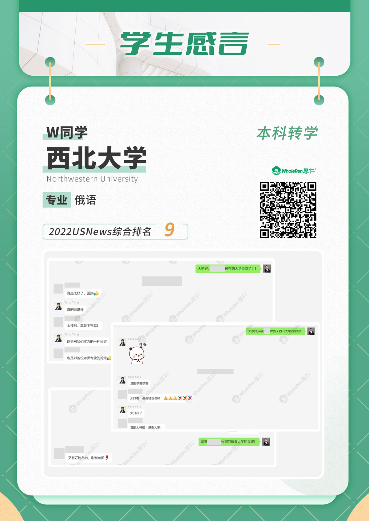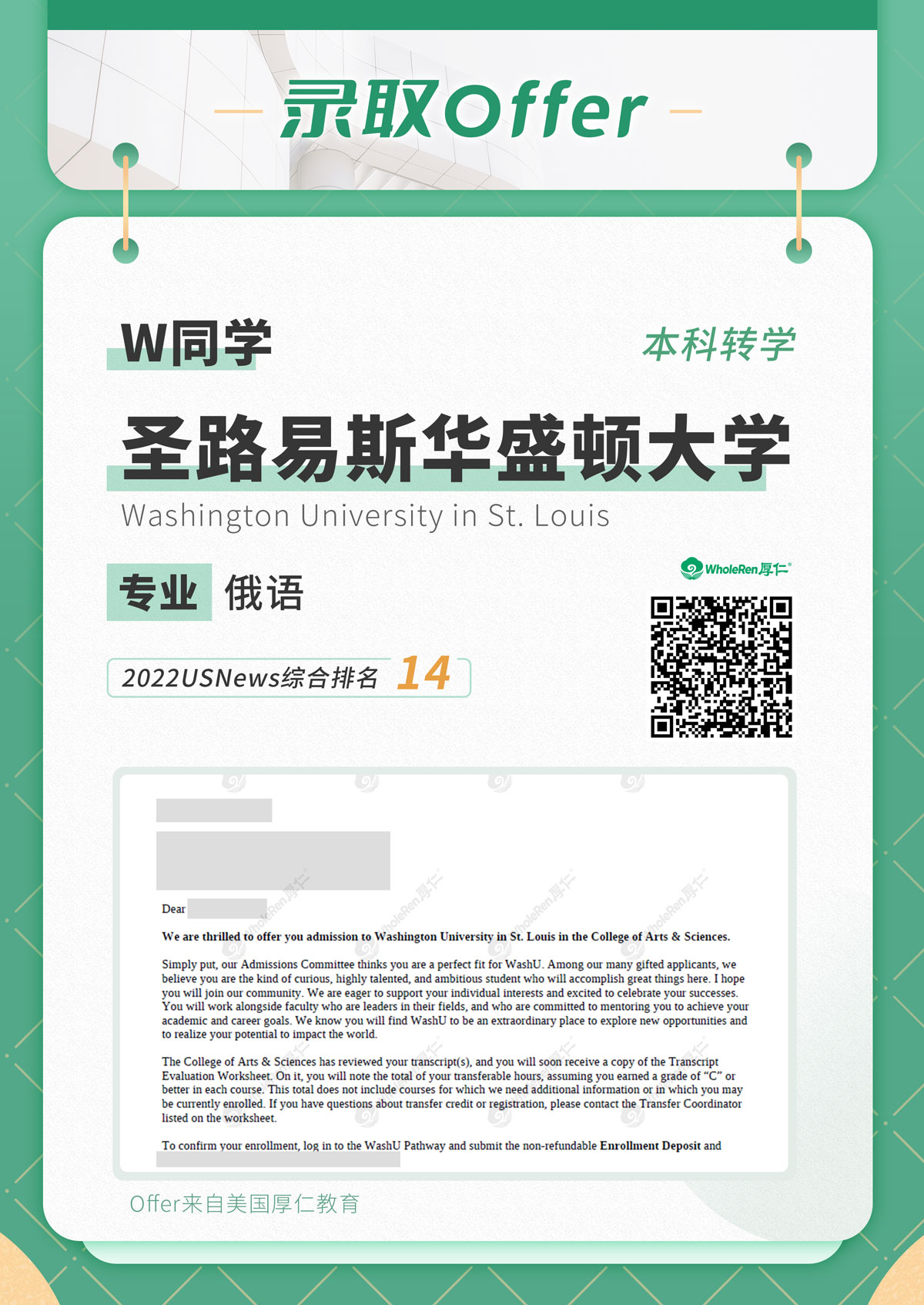 在W同学的积极配合下,最终获得了西北大学,华大圣路易斯,布朗大学,范德堡大学等多所TOP20大学的录取offer,实现了当初的名校梦想。