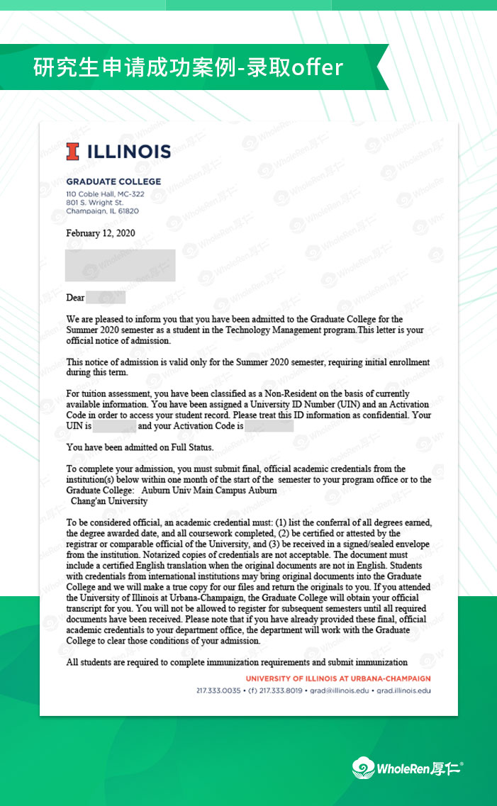 申请过程中,由于Z同学的GRE成绩不高,厚仁老师尽可能避开了对GRE有硬性要求的院校。同时,在Z同学目标学校UIUC的面试准备中,厚仁老师多次为他模拟面试流程和内容;并参与招生官在线讲座,一起深度分析招生官特点,最终给招生官留下深刻印象,一举拿下目标院校UIUC录取。