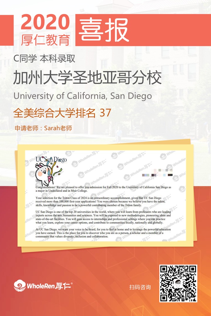 C同学初入服务时并不是那么的自信,经历过多次的SAT刷分,最终成绩依然锁定在1390(拼分达到1420)。在竞争日益激烈的本科升学大潮中,这个分数确实并不是很有竞争优势。 如何弥补呢?厚仁教育Sarah老师和楚博士在分析了C同学的综合情况之后,结合C同学突出的口语以及写作优势,建议C同学参加托福考试以弥补自己在SAT Reading & Writing部分的不足。同时在文书部分,重点突出了C同学的英语水平、尼泊尔支教的独特经历以及高于同龄人的思想境界。 最终C同学得以逆袭,在众多申请者中脱颖而出,一举拿到加州大学圣地亚哥分校、加州大学戴维斯分校、加州大学尔湾分校、佩普代因大学、波士顿大学、罗格斯大学、宾州州立大学、伊利诺伊香槟分校、康乃狄格大学的录取;同时也被放到了加州大学圣塔芭芭拉分校的候选人名单中。