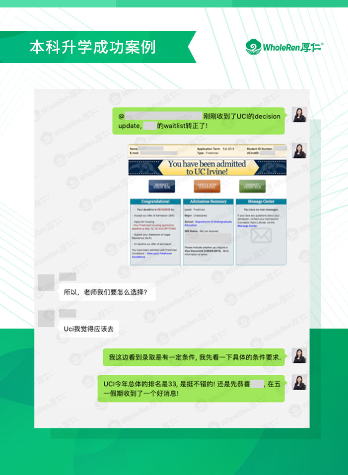 厚仁专家分析: X同学高中在校成绩不错,高二时在厚仁专家老师评估和帮助下,成功申请入读UCLA的夏校。夏校期间,X同学也获得厚仁在洛杉矶本地老师的帮助,最终取得不错的成绩。 回国后,厚仁老师们开始了大学申请的准备工作。但学生ACT考试成绩不太理想,好在背景比较丰富,文书的部分我们针对每所学校的喜好以及教学理念进行了分析,孩子也很积极地配合,用心完成。最后在被欧文放进Waiting list里后,我们又和学校继续争取,最终收获了好消息。这是很典型的低分高录案例,只要用心,很多不可能都可以变成可能。
