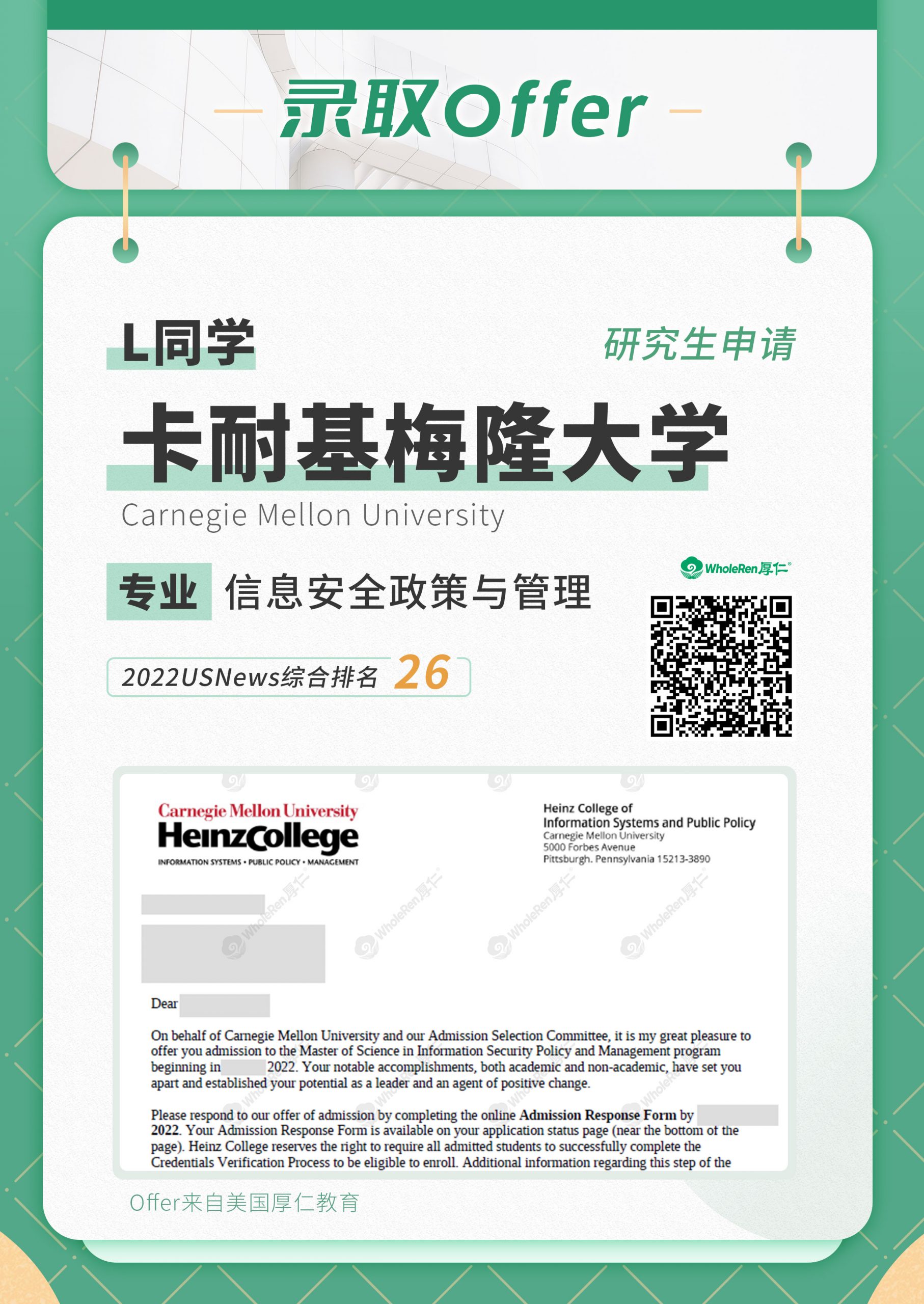 目前L同学收到了卡内基梅隆大学,波士顿大学,匹兹堡大学等录取。祝贺L同学,厚仁团队将陪伴L同学一路前行!