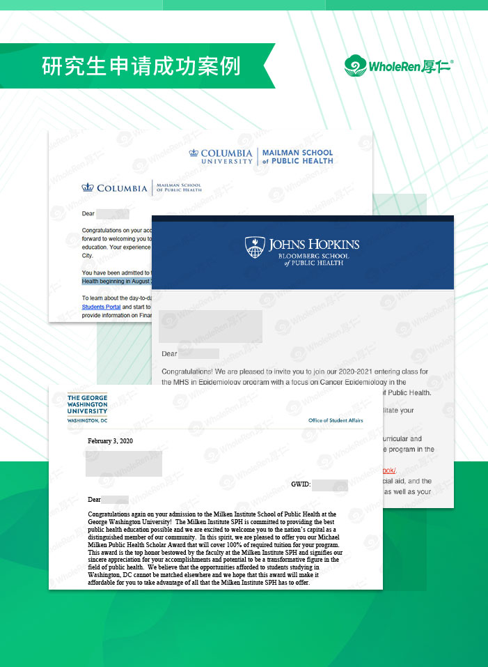 录取结果:哥伦比亚大学, 约翰霍普金斯大学(奖学金第一年25%学费,第二年50%), 乔治华盛顿大学(全奖100%学费)