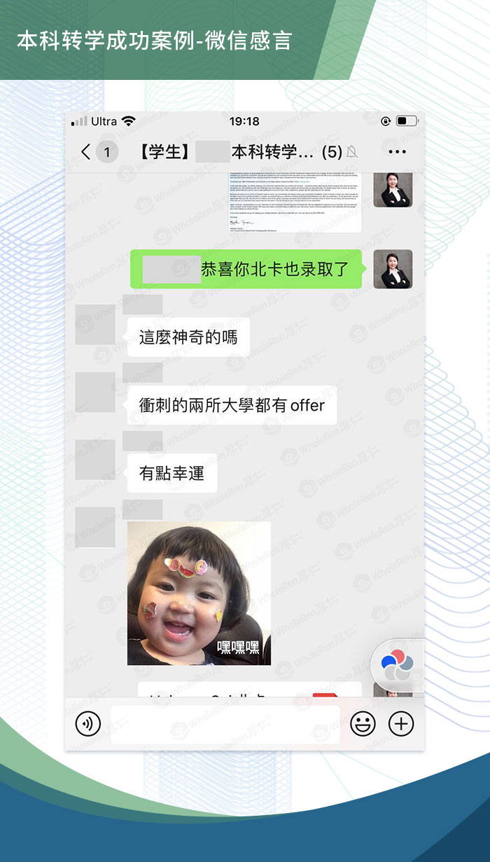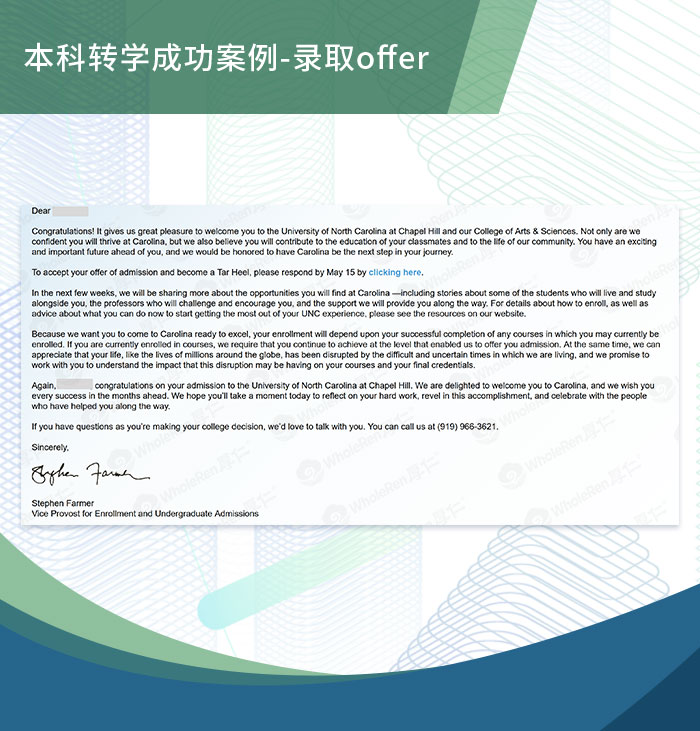 C同学一刷的托福成绩并不理想。如果因为几分之差错过梦校,太过可惜。因此厚仁老师鼓励C同学再努力试一下。二刷成绩也不是很理想,但通过拼分的方式,可以满足转学的最低要求。即便如此,厚仁老师还是尽可能的帮助C同学申请托福豁免,比如top30的北卡教堂山分校,就通过充分沟通,争取到了托福豁免。