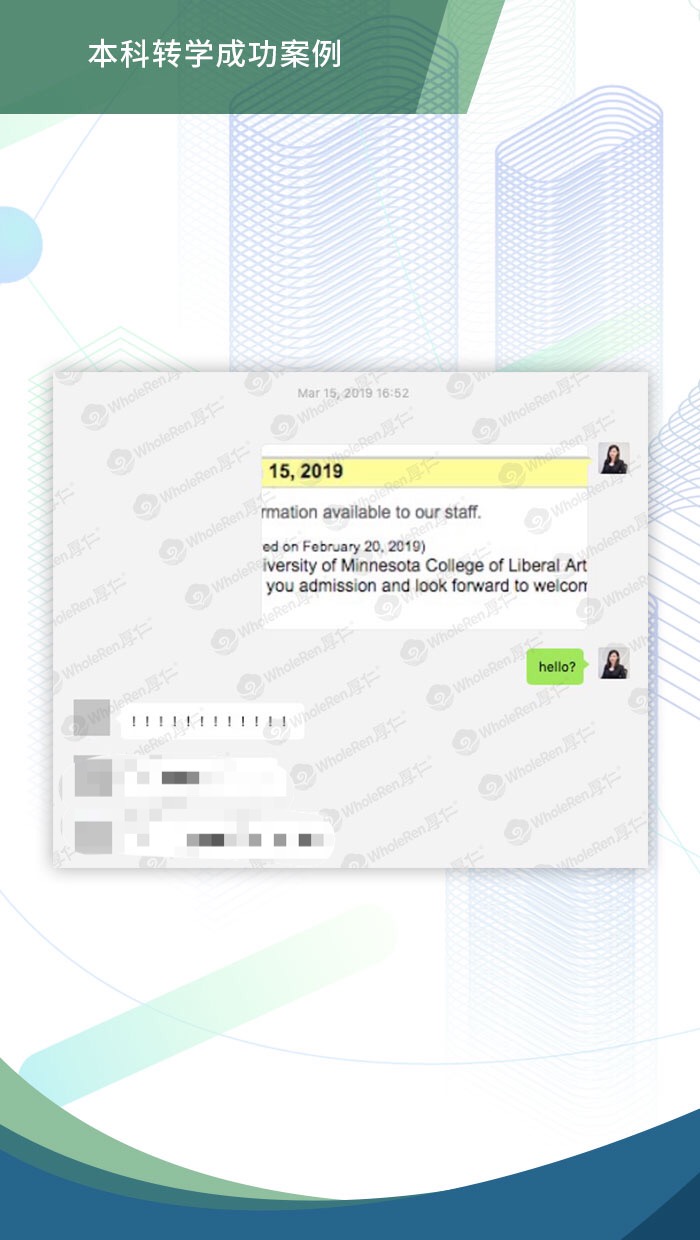 经历人生低谷后,Z同学痛定思痛,在社区大学期间努力提升成绩,还听从厚仁专家建议,积极参与数学俱乐部和数学竞赛,发现了自己的兴趣,并且和数学教授建立了良好的关系,获得教授很高的评价。转学申请中,孙老师帮助Z同学深度挖掘文书素材,体现学习潜力和对数学的热爱,最终成功打动招生官,拿到了梦校明尼苏达双城的录取。收到消息时,所有的所有都在Z同学一连串感叹号中,此时无言胜过一切有声的表达。