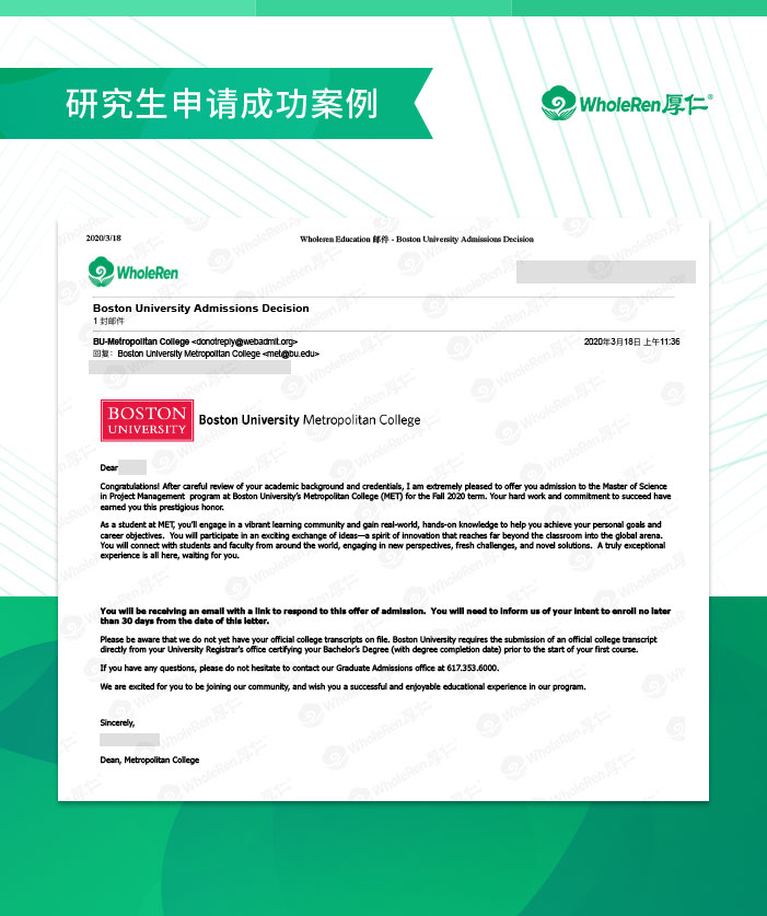 此前的两三段实习都是在国内的暑期实习,含金量并不高,厚仁老师在文书中重点突出L同学的工作难度和知识技能,把闪光点放大。 L同学最终获得波士顿大学等多所名校录取,祝贺!