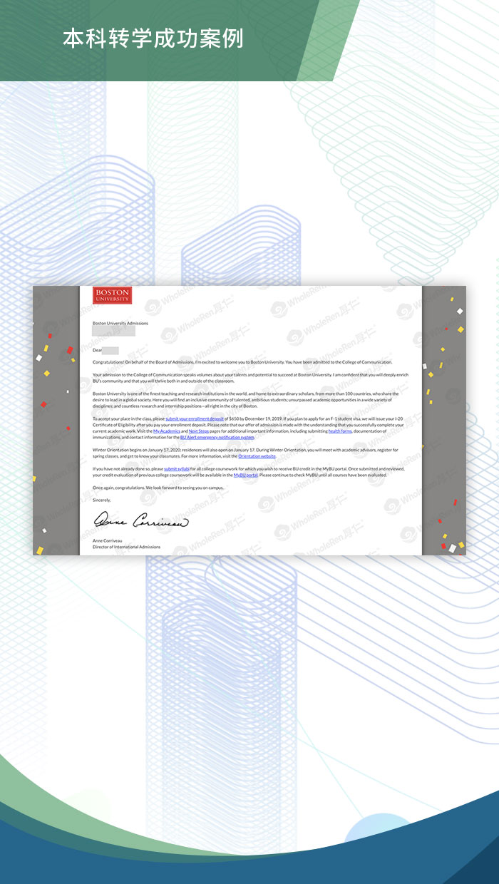 开始了传媒专业学习的L同学充分发挥了自己的特长优势,GPA一路飙升。在一年的学习之后,L同学决定不能止步于某州立大学分校,她应该到更大的平台去施展自己的才华。在厚仁Sarah老师的指导下,L同学开始了大三转学的规划,最终一举拿下波士顿大学的传媒专业录取。