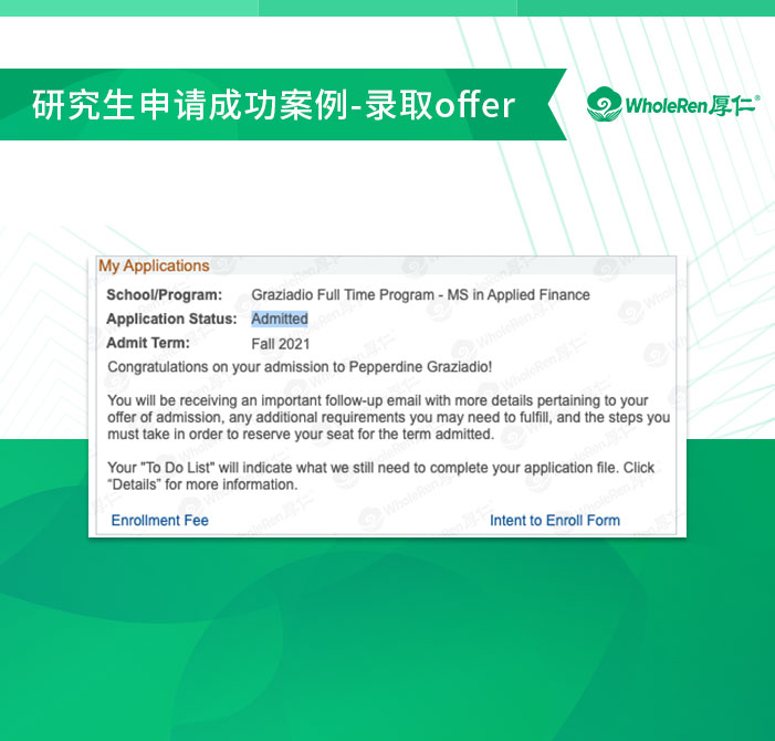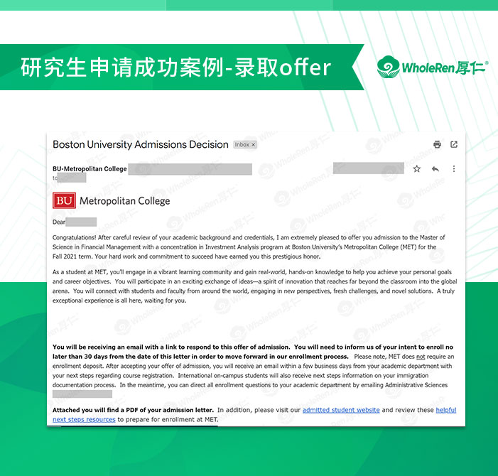 经过多方面的努力,Q同学最终拿到了Boston University和Pepperdine University的录取。厚仁团队祝福Q同学在今后的留学道路上一帆风顺!