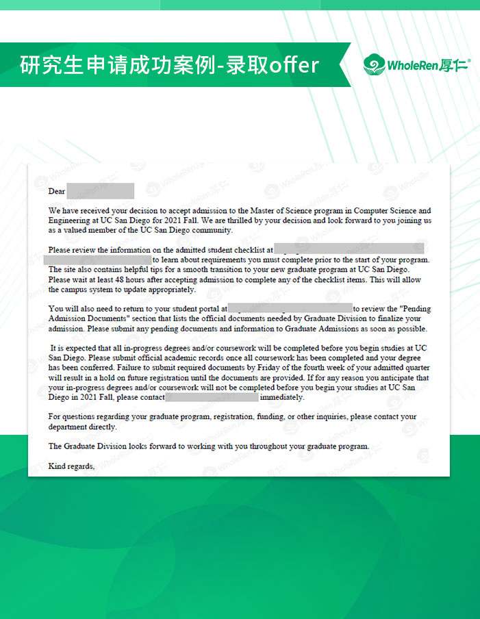 最终S同学拿到了包括约翰斯霍普金斯大学、加州大学圣地亚哥分校在内的多所顶尖专业院校的录取。厚仁团队祝福S同学在今后的留学道路上一帆风顺!