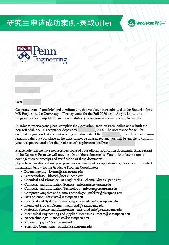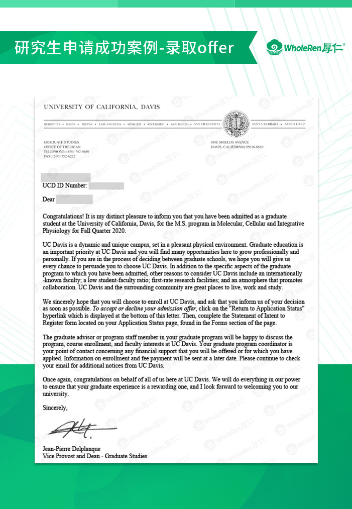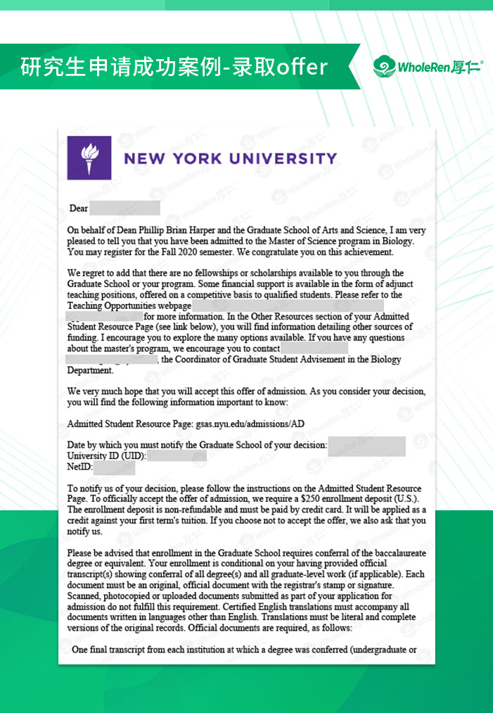 在择校方面,由于纯生物专业在很多顶尖学校硕士项目较少,且尤其看重科研背景,因此建议我们Z同学扩大择校范围,纳入一些顶尖学校的生物类交叉学科,应用性更广,也能为未来提供更好的基础。申请过程中,厚仁老师指导Z同学拿到暑期科研项目的导师推荐信,证明该项目的含金量。同时,我们和Z同学多次沟通课程上做过的一些实验,从中挖掘亮点,充实到文书中。申请老师还从整个时间轴上严密规划严格把关,比如国内大学申请美国院校必须完成的第三方成绩认证等,保证Z同学按时提交申请,不错过重要日期。