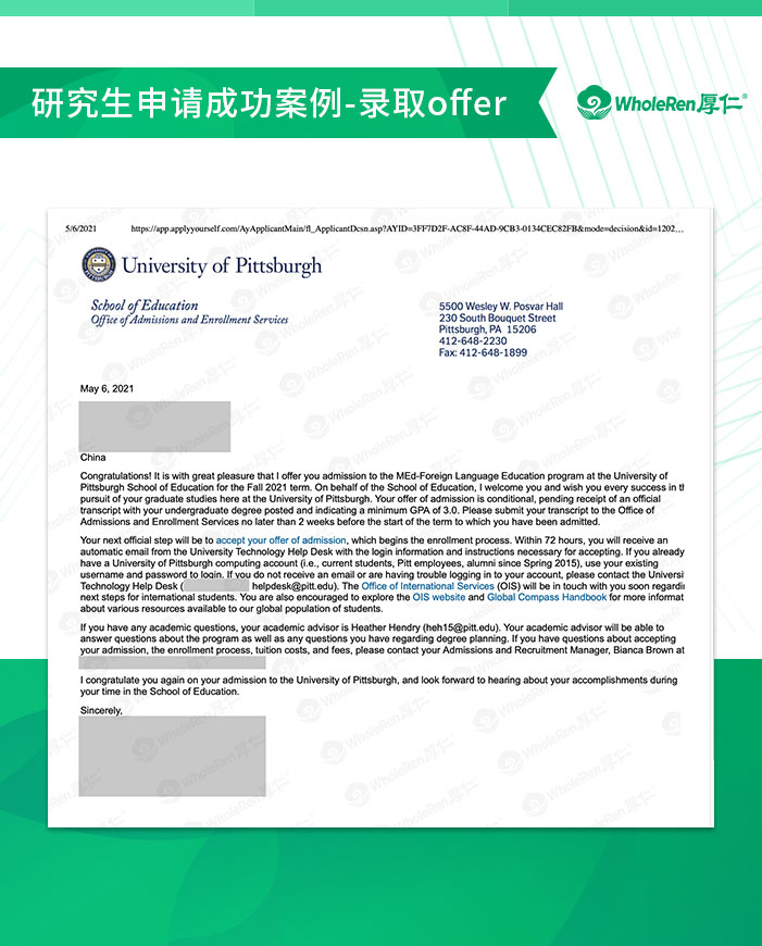 最终,D同学被匹兹堡大学录取,D同学非常喜欢匹兹堡大学,决定去匹大。厚仁团队将陪伴D同学一路前行!