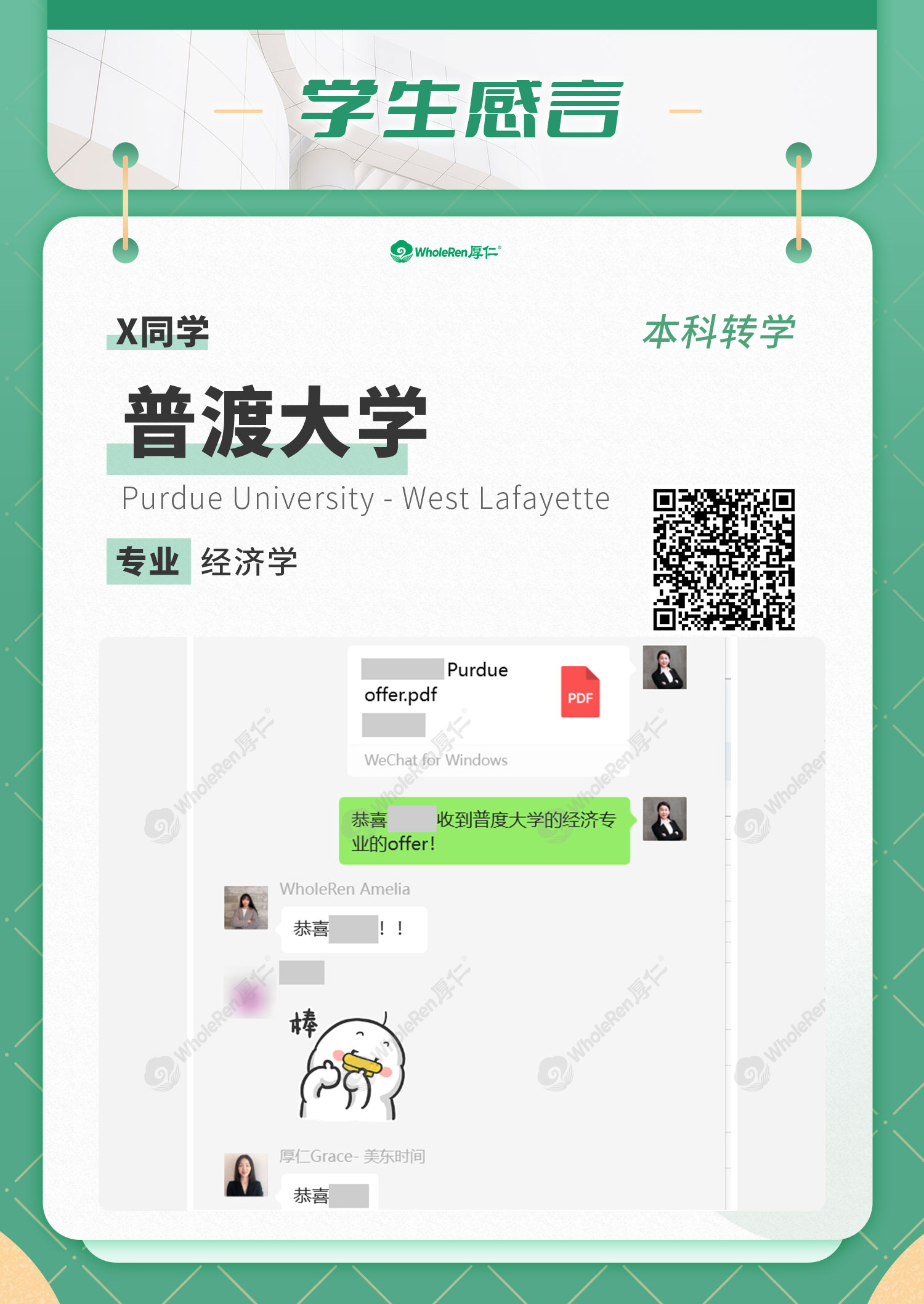 最终,学生拿到普渡大学的录取,突破了自己。X同学十分开心,并希望继续选择厚仁团队,为其规划暑假及后续长期研究生申请。恭喜X同学,祝学业顺利,未来可期!