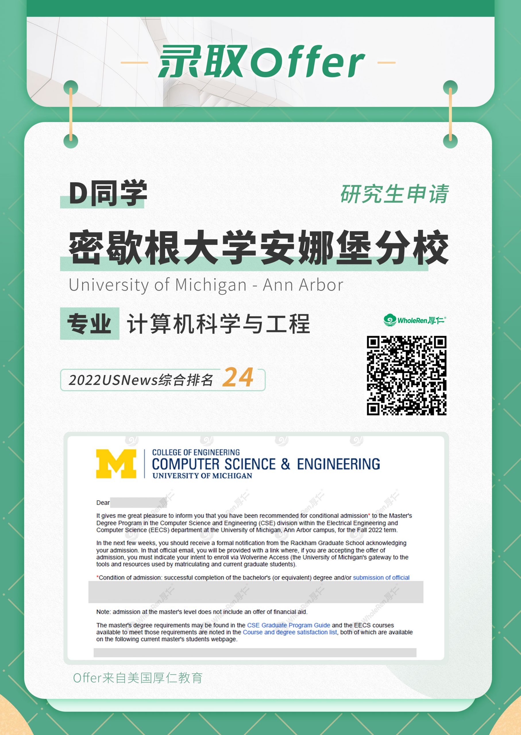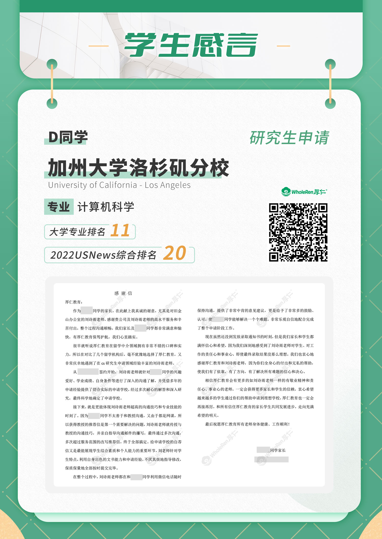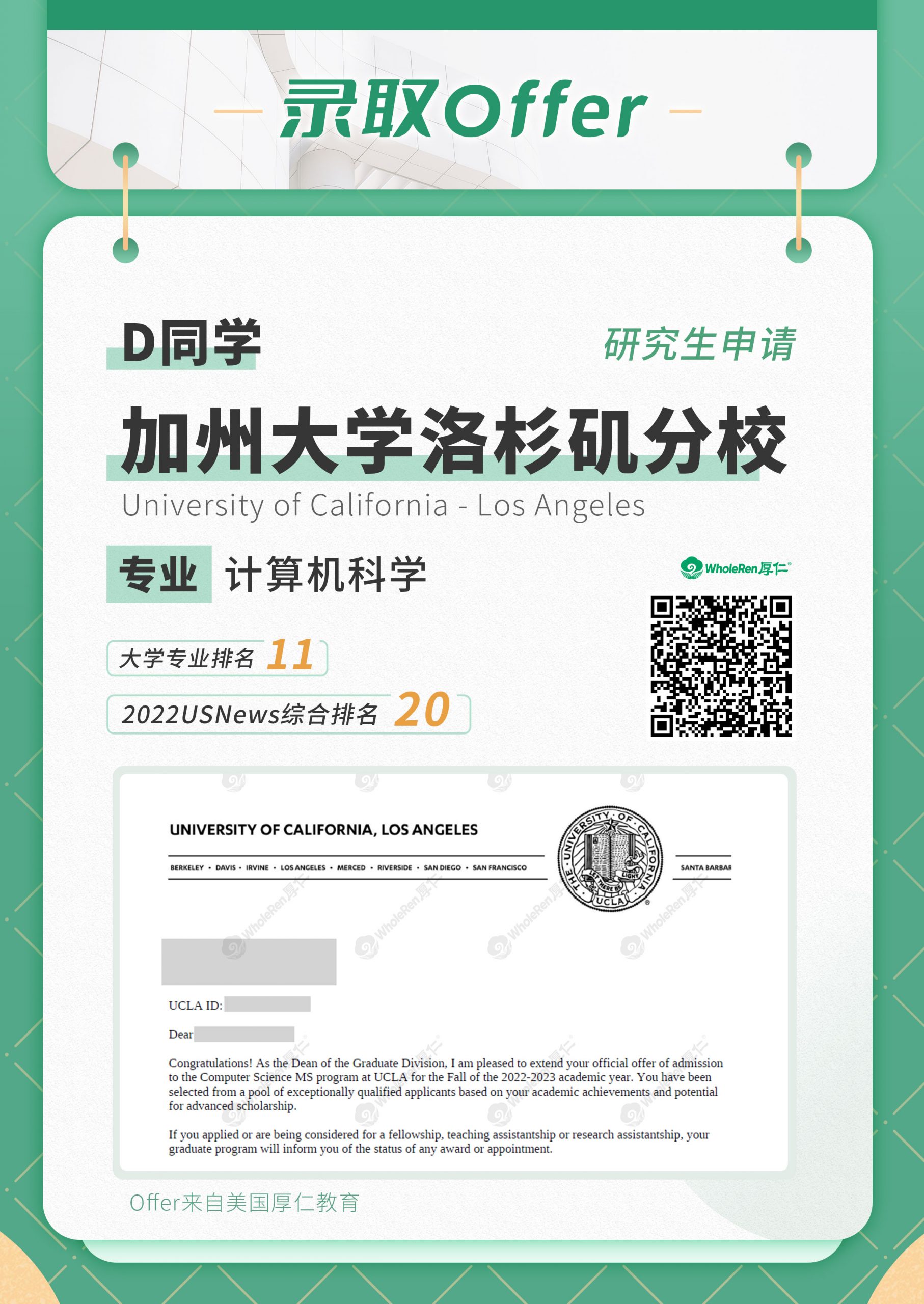 让我们欣喜的是,D收到了UCLA、密歇根安娜堡、南加大等名校的录取!