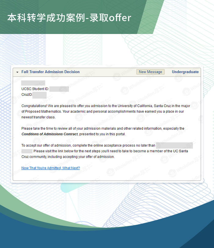 录取结果:加州大学洛杉矶分校 UCLA 罗切斯特大学 UR 加州大学圣塔芭芭拉分校 UCSB 加州大学尔湾分校 UCI 加州大学戴维斯分校 UCD 加州大学圣地亚哥分校 UCSD 威斯康星大学麦迪逊分校 加州大学圣克鲁兹分校 UCSC 加州大学河滨分校 UCR