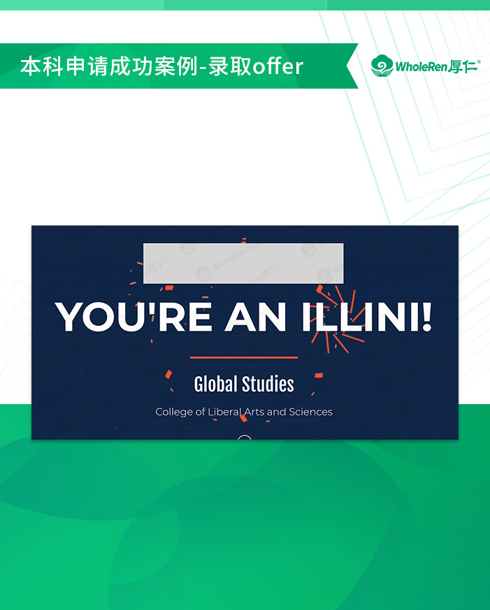 最终X同学收获了伊利诺伊香槟分校的Global Studies录取,该专业涉及到文化、经济、政治、政策等,属于跨学科,正好满足X同学的兴趣和未来的就业方向。厚仁团队将陪伴X同学一路前行!