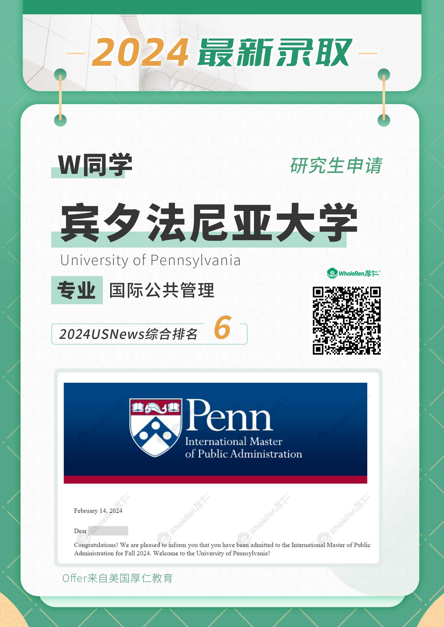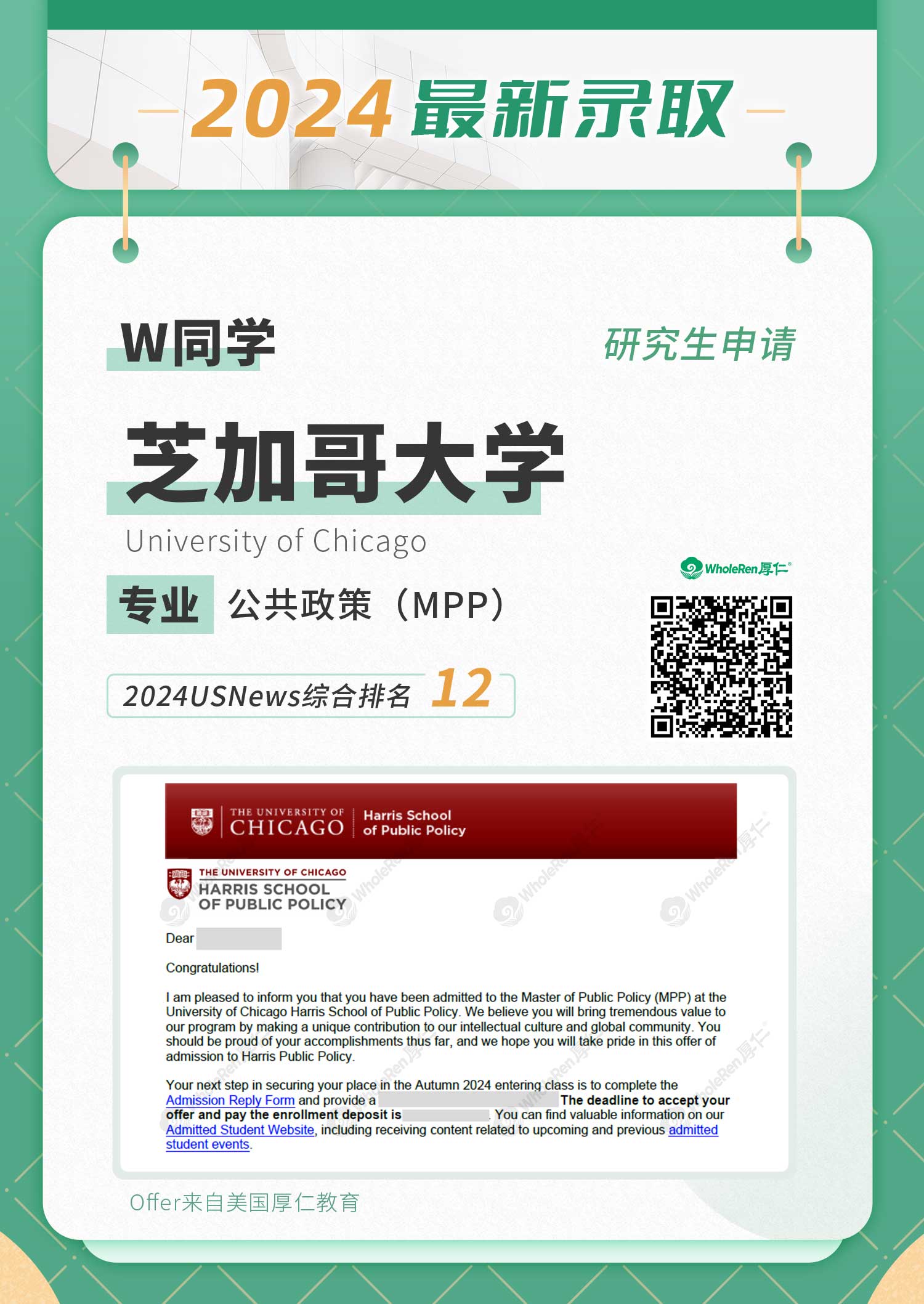 申请时,由于W同学是厚仁长期服务的学生,厚仁团队对学生的整体背景和诉求有很充分的了解,学生也比较配合。选校阶段,学生的目标明确,希望申请排名更高的顶级名校,专业没有太多倾向。申请团队推荐了公共政策方向。在背景提升方面,在本科阶段,我们为W同学规划了多段厚仁求职的实习/科研项目,丰富自身背景。在课外活动方面,针对申请方向,我们为W同学申请了芝加哥大学和北大合作的对口项目夏校,对申请帮助很大。