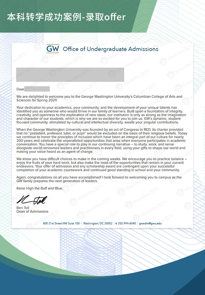 F同学是属于大三上转大三下,英语标化没有。选学校的时候,厚仁团队老师尽量选择了用大学英语课可以豁免英语成绩的学校,同时解释文书里写清楚为什么大一的时候成绩比较低。根据F同学地理位置的要求,选择DC附近的学校,结合综合排名。提示F同学申请学校的时候争取面试机会,每一题面试练习多次,向学校证明自己的热情。文书老师与F同学充分沟通,指导F同学根据每一个学校修改相应的学校的特色的内容,精心雕琢多次。