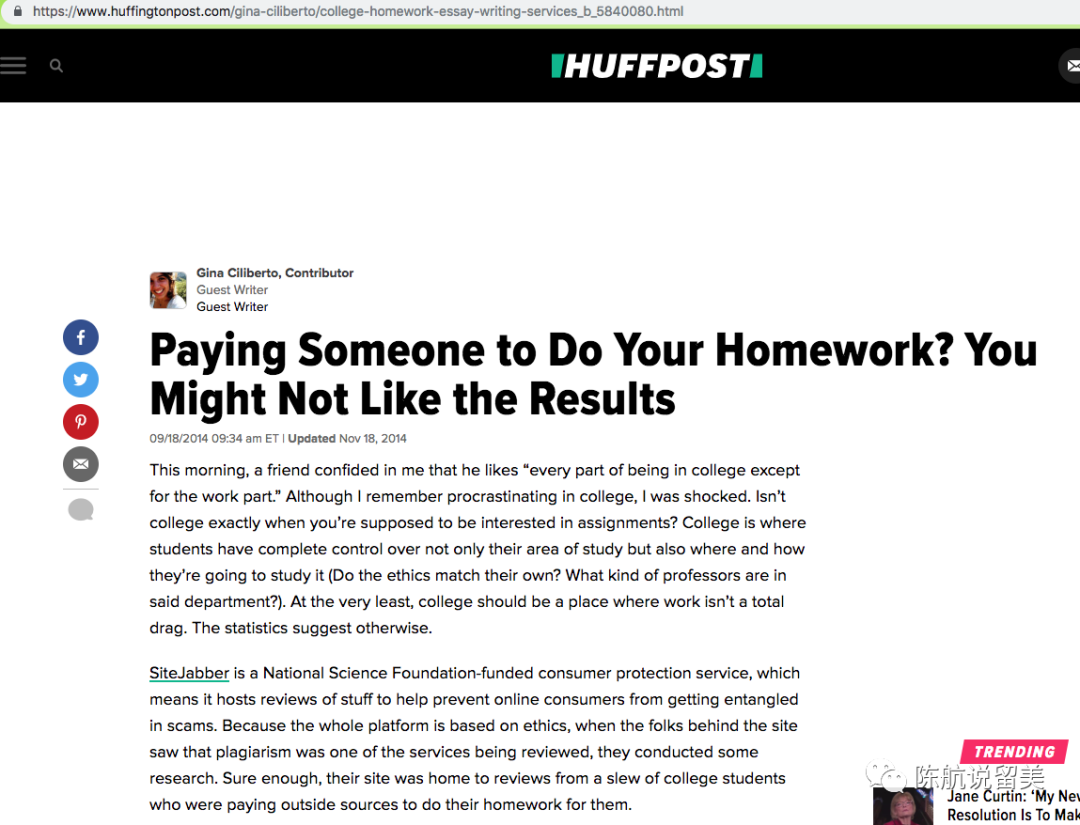 交钱给别人写作业?你可能不满意结果。文章中用SiteJabber,一个美国国家科学基金会资质的用户评论机构,其数据显示,消费者对这些代写作业的服务差评非常多。