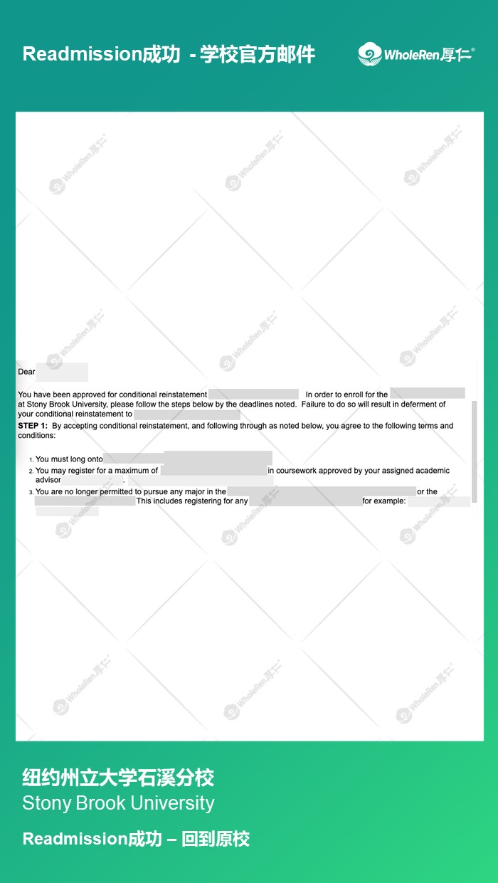 专家老师帮助学生紧急转学到新的学校,并分析学生在学习上存在的问题,指导学生在新的学校一步步改善,保持良好的成绩,最后在专家老师的帮助下,成功Readmission回到原校。