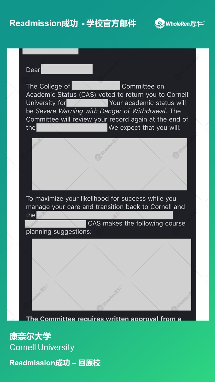 W同学在新的学校保持了良好的学术成绩,配合老师积极准备Readmission申请材料,最终顺利返回原校继续学业。