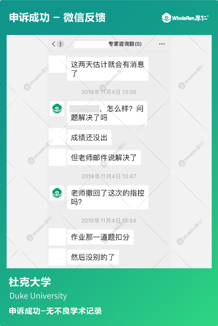 X同学初到美国,因为不了解引用要求,想借鉴网上的内容但是引用不当,被老师举报抄袭。 厚仁的专家老师分析X同学的作业内容后,指导学生对初来美国不了解引用要求作出解释,针对此事做了深刻反省并做出未来学习规划,让老师相信学生不是故意违纪,最终老师的处理结果是作业扣分处理,无不良学术记录。