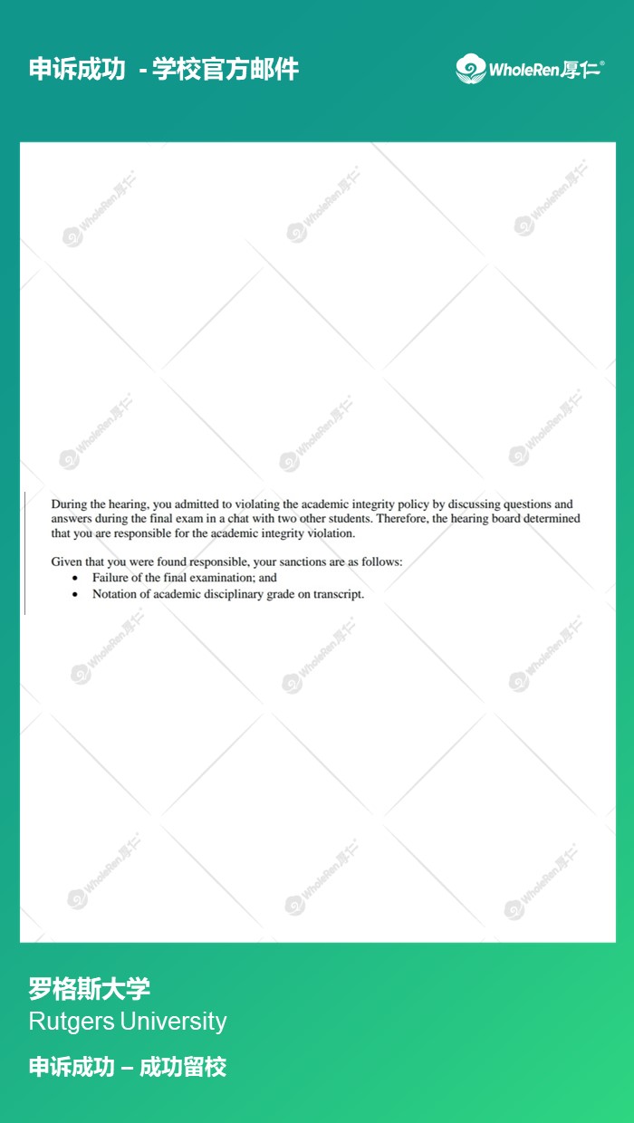 专家老师在了解学生考试经过后,指导学生准备申诉材料,最终成功撤销停学处分,学生可以继续学业。