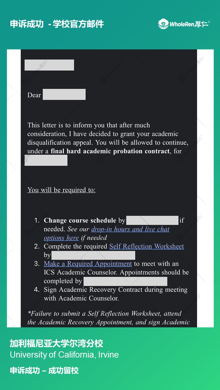 Y同学在社大转到UCI后专业课挂了3次,由于对学校政策不了解,以为可以一直重修课程便没有重视,导致GPA低被学校开除。