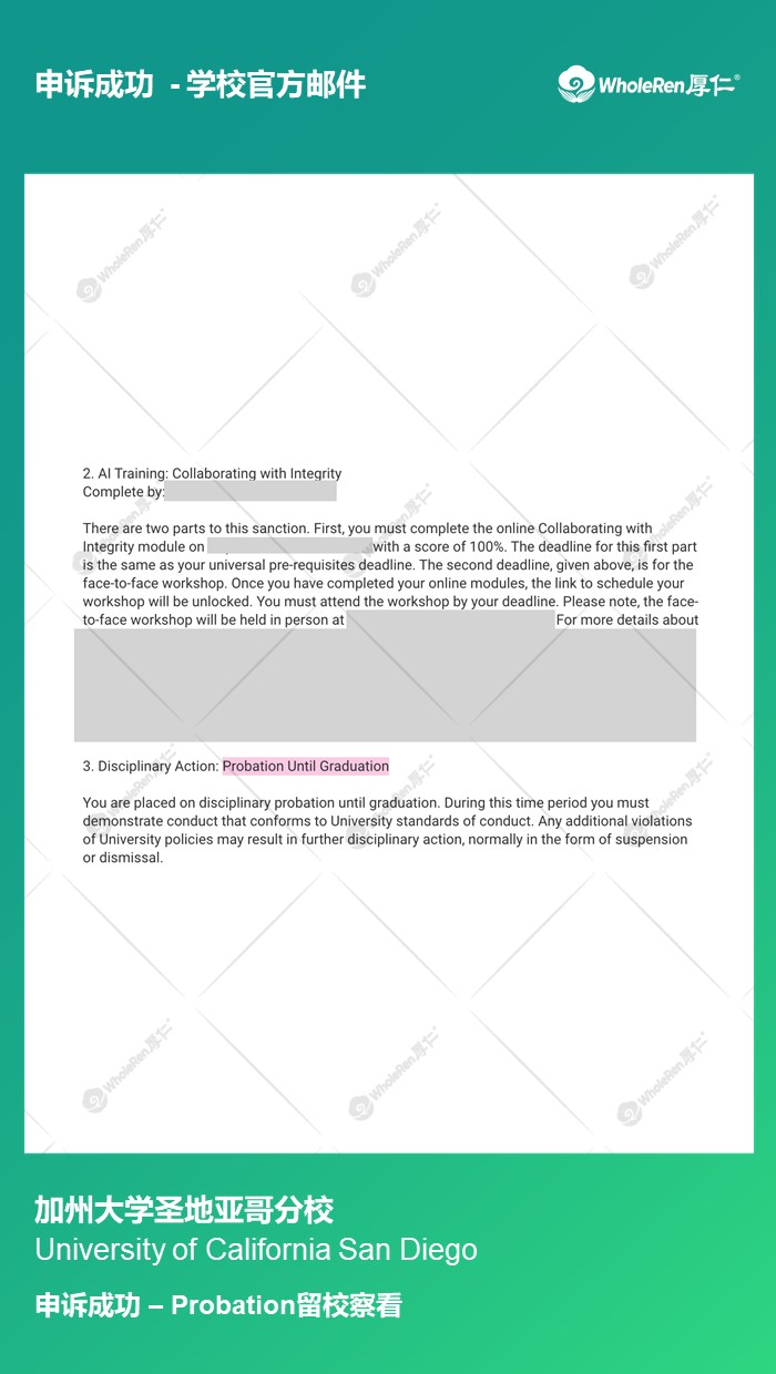 专家老师在了解事情经过后,指导学生解释证明自己的作业独立完成,针对将自己作业给别人借鉴的错误行为作出诚恳道歉和求情,最终Probation留校察看。