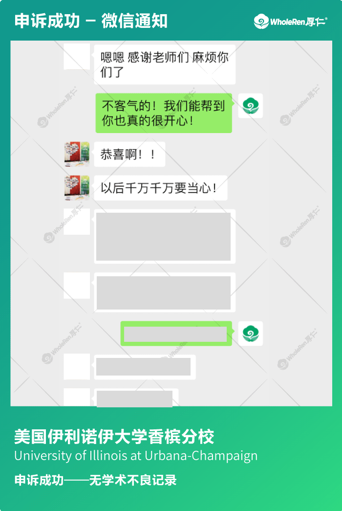 M同学是UIUC大四的学生,因为与同学的作业相似度高被老师怀疑互相抄袭。M同学因为第一次违纪,非常慌乱,想试图隐瞒与同学一起做作业的事实。 厚仁的专家老师在了解情况后,及时制止了学生想撒谎的想法,建议学生在事实的基础上寻求利益最大化,并指导学生与学校老师沟通,最终老师只给了作业0分,没有学术不良记录。