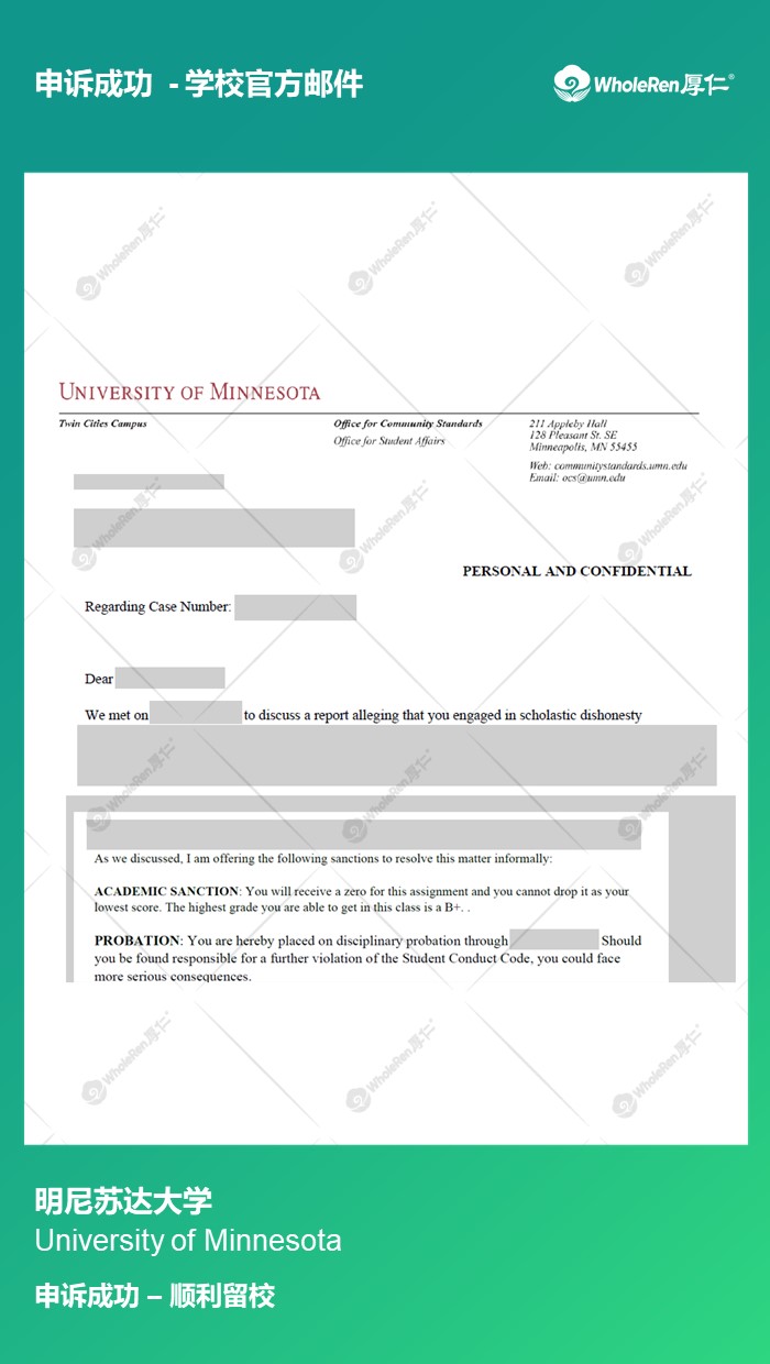 专家老师在分析学生的作业后,指导学生解释抄袭的原因,并针对自己的错误行为作出诚恳道歉和求情,最终作业0分,继续probation,顺利留校。