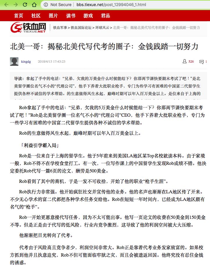 我再讲个真实的故事,发生在爱荷华大学的一件,令业内震惊的网课 代考 代上课事件,此事路透社有一篇专门的深入报道,标题就是“一个产业链是如何帮助中国学生通过欺诈进入和留在美国大学的”。