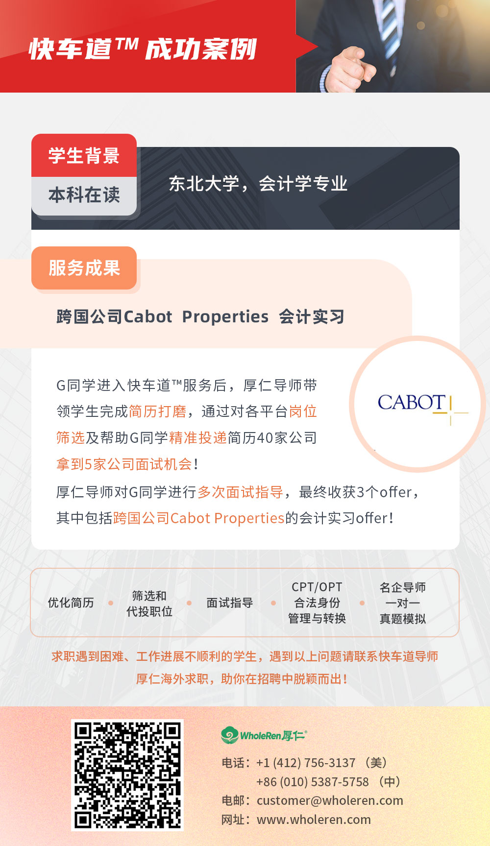 服务成果:跨国公司Cabot Properties 会计实习offer