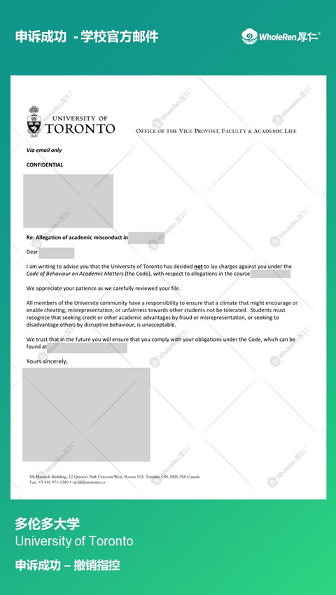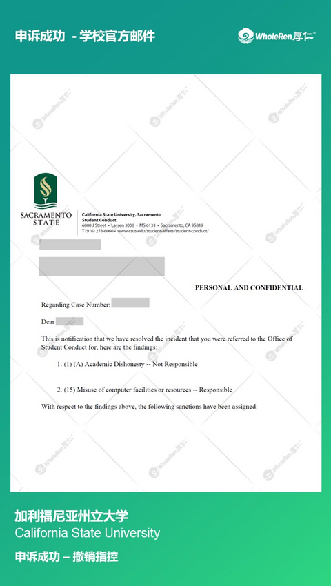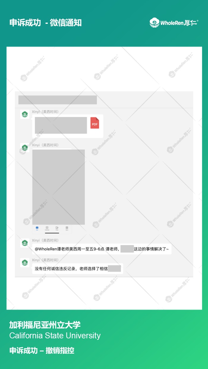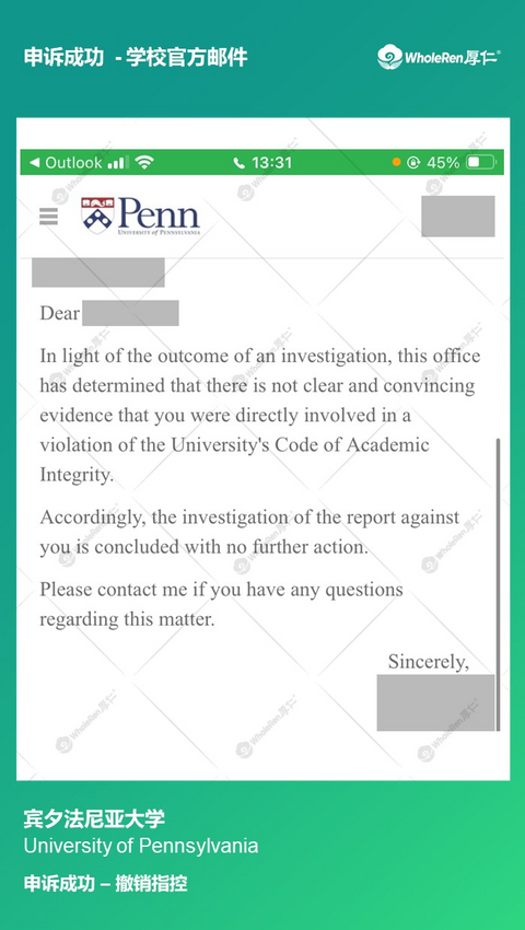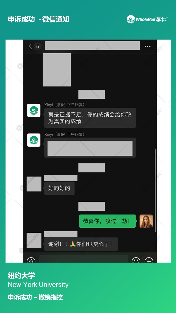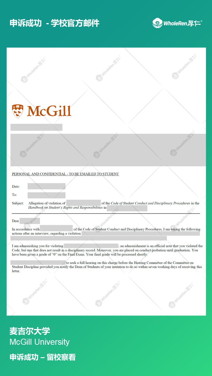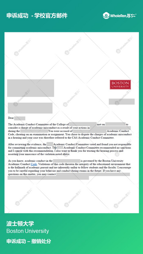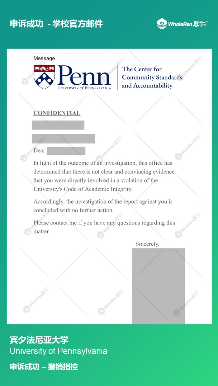 这类申诉需要充分证明自己没有作弊动机,并让老师相信自己。厚仁处理过很多类似的案例,专家老师会帮助学生分析误会产生的原因,指导学生准备支持性材料,并通过完成优质的申诉信证明学生的清白,最后成功申诉,避免处分。 我要立刻咨询! -
