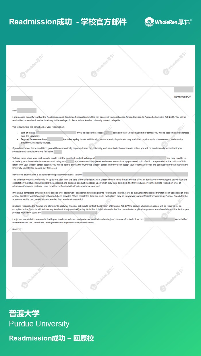 Y同学因为没有合理的学习规划,在进入专业课学习后出现了成绩持续不达标的现象,被学校开除。 专家老师帮助学生做好学习规划,提升成绩,并根据Readmission的申请要求完成优质文书,最终Y同学顺利返校继续学业。