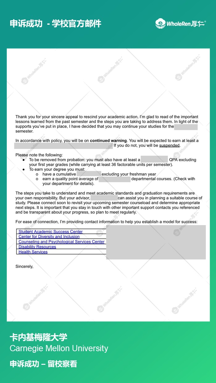 成功留校或紧急转学后,学生通常被要求保持良好成绩,如再次出现成绩不达标或违纪行为,学生将会再次面临学术危机。查看申诉成功案例 >