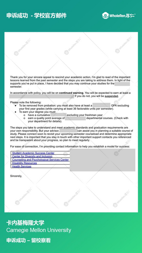W同学因为时间安排不合理,导致实习占据了多数时间,放松了学业,某一学期的GPA低于2.0,学校直接发来了停学通知。 专家老师在了解学生的学习情况后,指导学生提交申诉信,做好合理的学习规划,并证明自己的学习能力,最终申诉成功留校,成绩达标即可撤销probation记录。