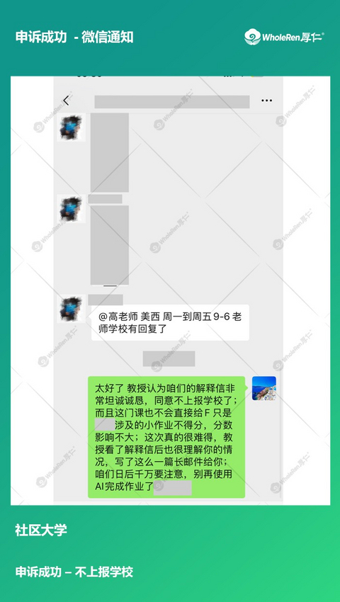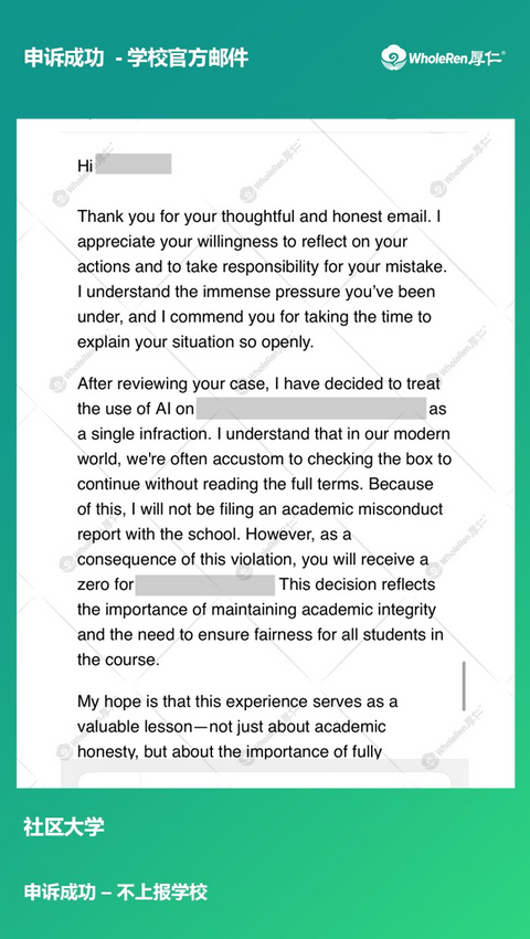 H同学在一次课程中多次用了AI内容,被老师发现要给F成绩。由于学生之前有过一次不诚信的记录,再次违纪将会面临开除的风险。 专家老师帮助学生准备面谈内容,指导学生合理解释自己的情况,并提出弥补措施,最终老师同意学生补考,没有挂科。