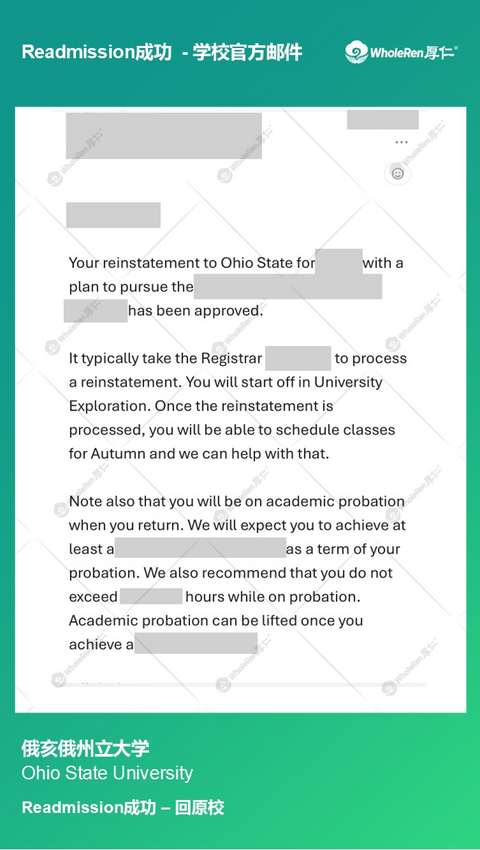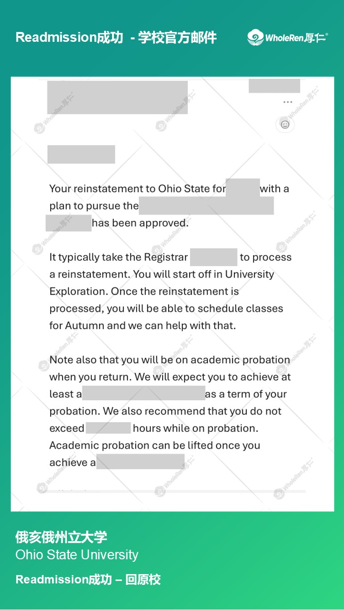 X同学在来到美国后一直没有合理的学习规划,导致成绩持续不达标被学校劝退。专家老师在了解学生的情况后,帮助学生合理规划之后的学业,并在Readmission申请中换了新的专业,最终顺利返校成功。