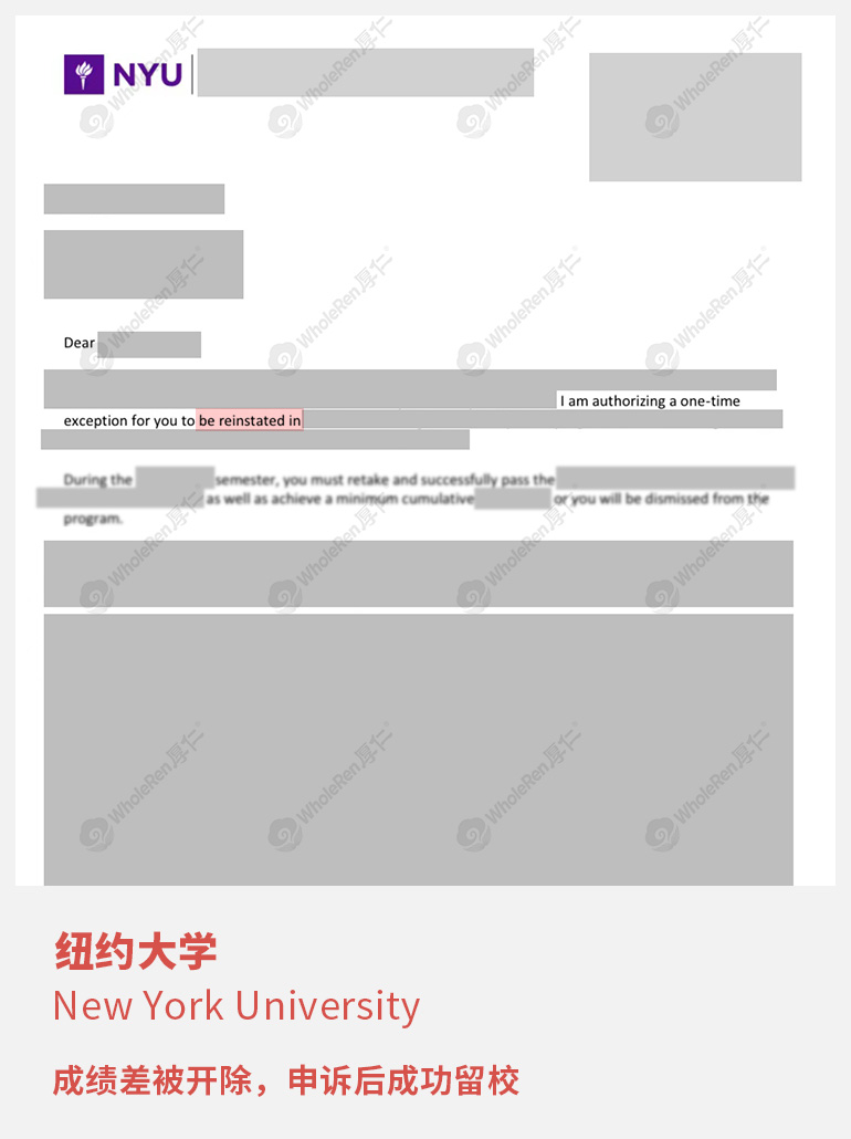 Y同学在读书期间因为家庭问题以及自身健康问题,导致难以专注于学习,因此成绩持续下滑,被学校劝退。 在专家老师的帮助下,转到了附近的学校过渡,针对在学业中存在的问题,制定了学习改进计划,提升学术能力。最终成功通过学校的Readmission审核,顺利重返NYU继续学业。