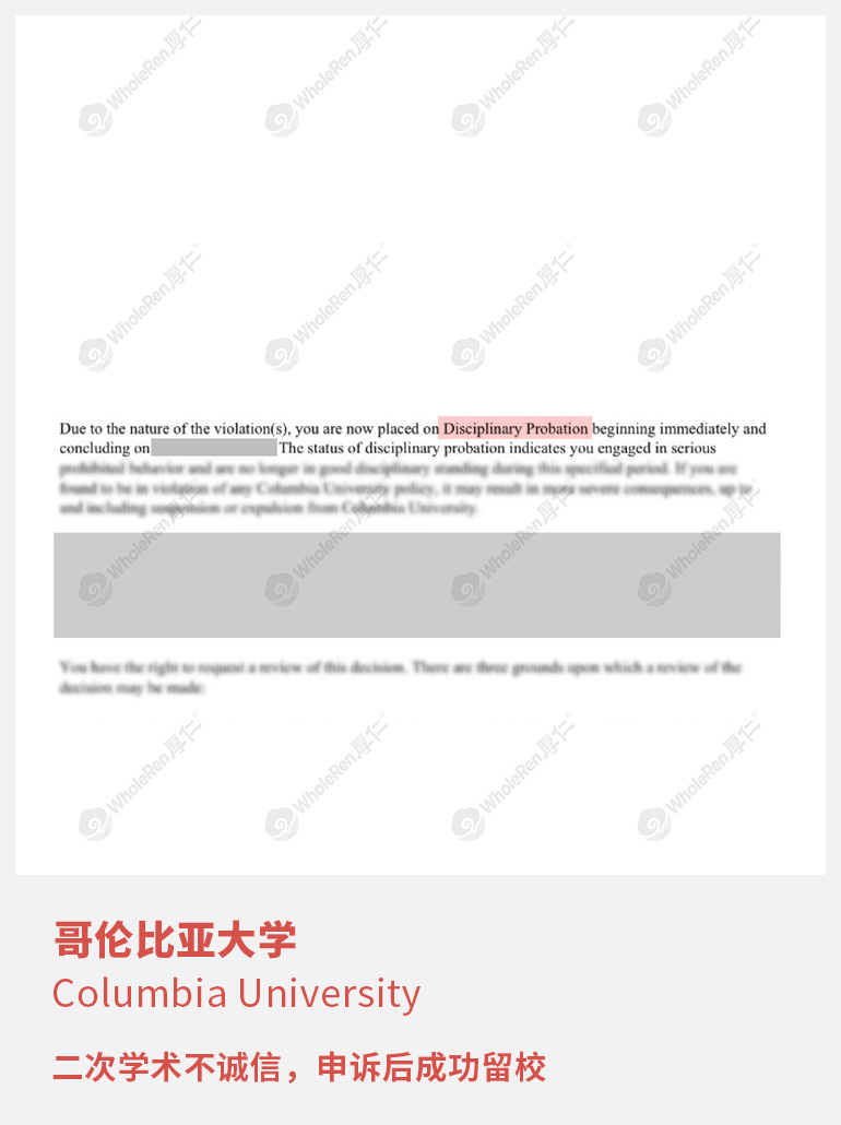 E同学在一次考试的时候想核对答案便打开了课件,被老师在后台查到,于是上报了学校,要召开学术诚信听证会。通常哥大的研究生第一次出现学术不诚信的行为时会受到停学的处分,所以学生很可能无法顺利毕业。专家老师了解学生的情况后,指导学生积极准备听证会的材料,证明自己无作弊动机,最终成功说服了学校,只给了probation的警告处理。